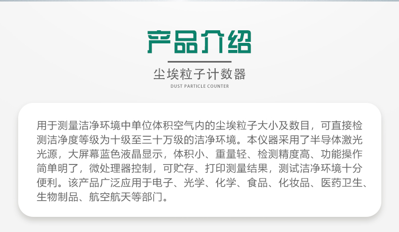 二、塵埃粒子檢測(cè):塵埃粒子計(jì)數(shù)器是用于測(cè)量潔凈環(huán)境中單位體積內(nèi)塵埃粒子個(gè)數(shù)和粒徑分布的儀器。按照使用場(chǎng)合劃分可分為普通空間、潔凈空間兩種。按照測(cè)試通道按測(cè)試通道可分為單通道(只測(cè)某一種粒子徑);雙通道(測(cè)試某兩種粒子徑); 多通道(測(cè)試多種粒子徑)。