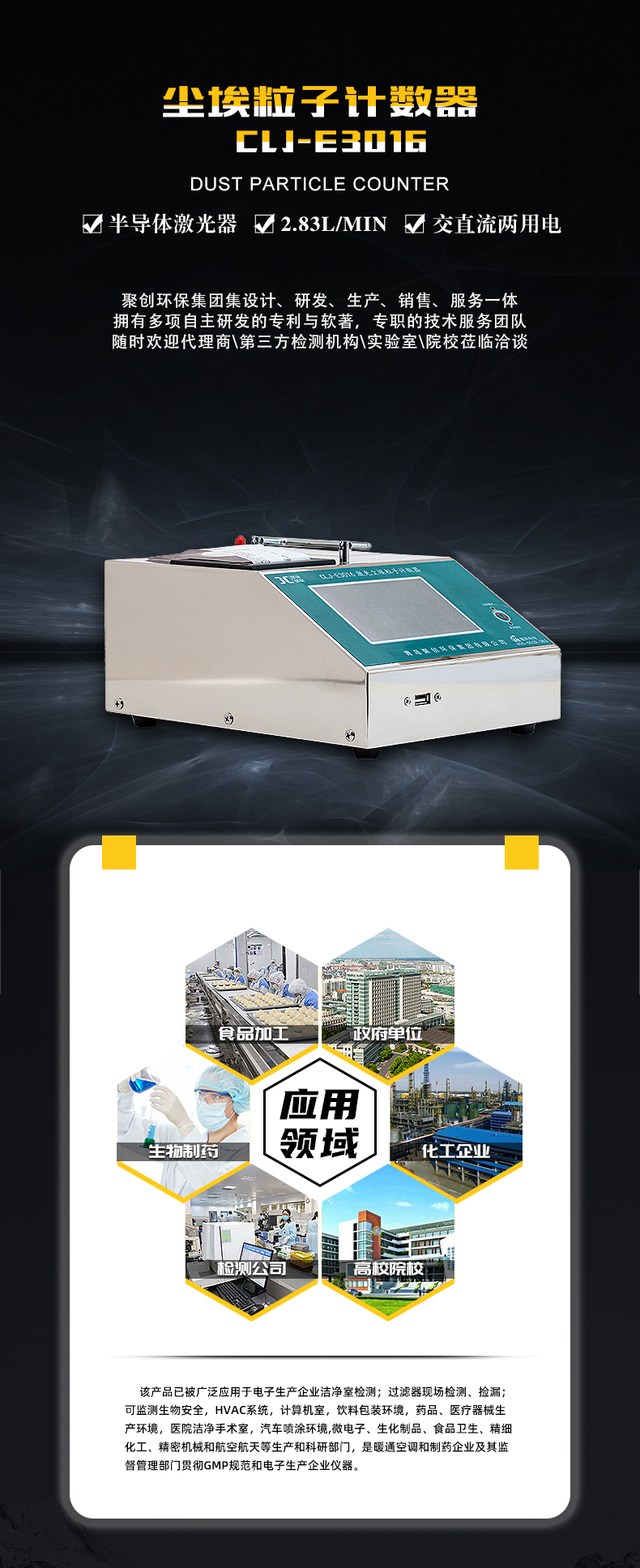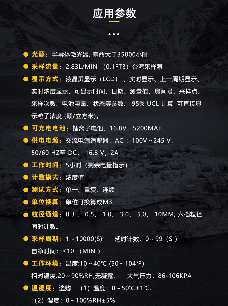 該儀器是公司新研制成功的采用全半體激光傳感器的激光塵埃粒子計數器,技術指標均滿足國家計量總局頒布的JJF1190-2008檢定規程的要求,整機功能采用美國微電腦控制處理技術及半導體激光傳感器技術及進口氣泵,具有功能多、測量精度高、速度快、便于攜帶和操作簡單等特點。儀器一次采樣可同時測得多種粒徑的塵埃粒子數,該產品已被廣泛應用于電子生產企業潔凈室檢測;過濾器現場檢測、撿漏;可監測生物安全,HVAC系統,計算機室,飲料包裝環境,汽車噴涂環境,微電子、生化制品、食品衛生、精細化工、精密機械和航空航天等生產和科研部門,是暖通空調企業及其監督管理部門貫徹GMP規范和電子生產企業儀器。