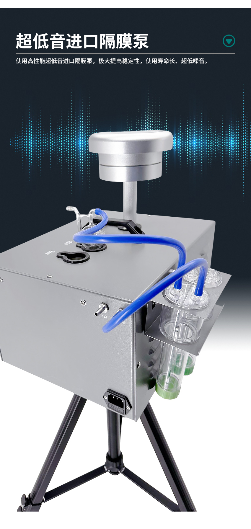 3. 大氣使用高性能超低音進口隔膜泵,極大提高穩(wěn)定性,使用壽命長、超低噪音。