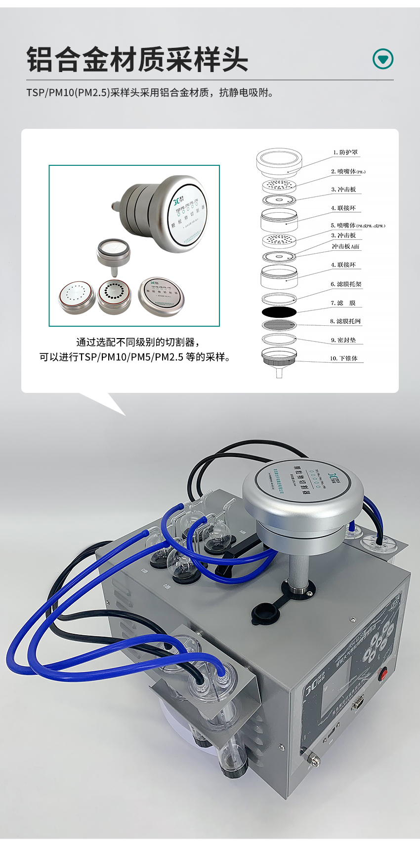 8. TSP/PM10(PM2.5)采樣頭采用鋁合金材質(zhì),抗靜電吸附。