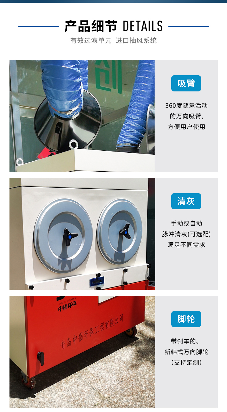 3、利用可360度隨意活動的萬向吸臂,可從煙氣發生處吸除煙氣,大大提高了煙塵的收集率,保證了作業人員的健康。
