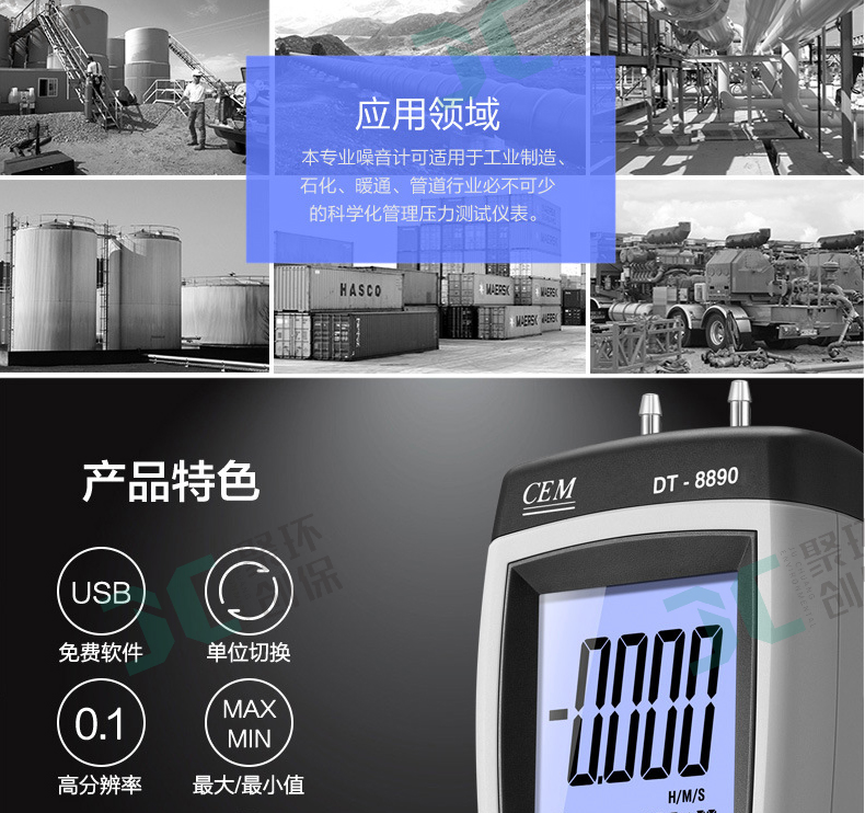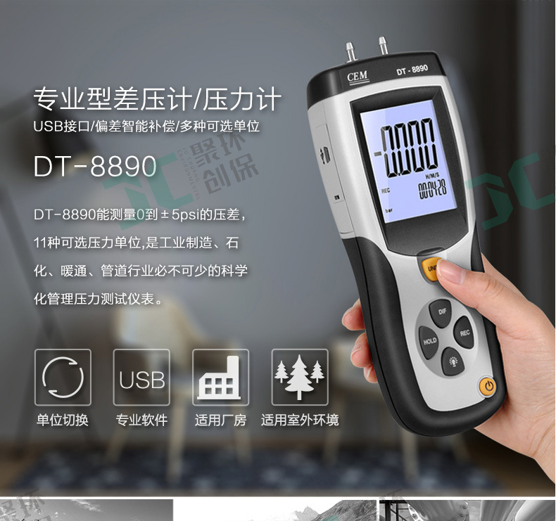 DT-8890/DT-8890A能測量0到±5psi的壓差,11種可選壓力單位:inH2O、psi、bar、mbar、kPa、inHg、 mmHg、ozin2、ftH2O、kgcm2。具有數據保持,*大值/*小值/平均值保持、調零、偏移和數據補償。USB連接功能實現人機同步測量,以 及測量數據的保存和科學分析以便為每一項決策提供*佳數據化依據。是工業制造、石化、暖通、管道行業必不可少的科學化管理壓力測試儀表。