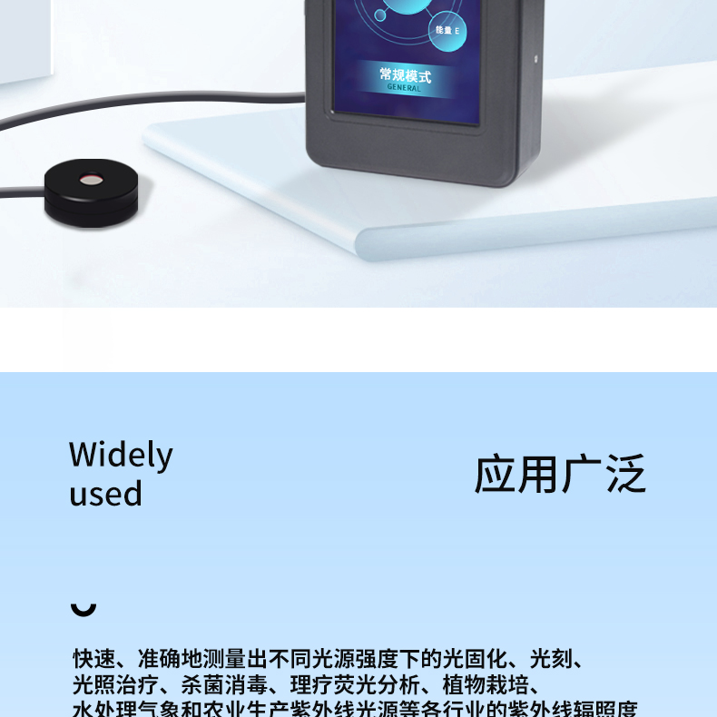 儀器分為主機和探頭兩部分,同一主機可根據不同使用需求搭配多款探頭,即插即用,滿足更多使用場景,可廣泛應用于實驗室、工廠或其他現場操作,幾乎可以在所有應用領域的質量控制中實現準確的紫外線光強、能量測試。