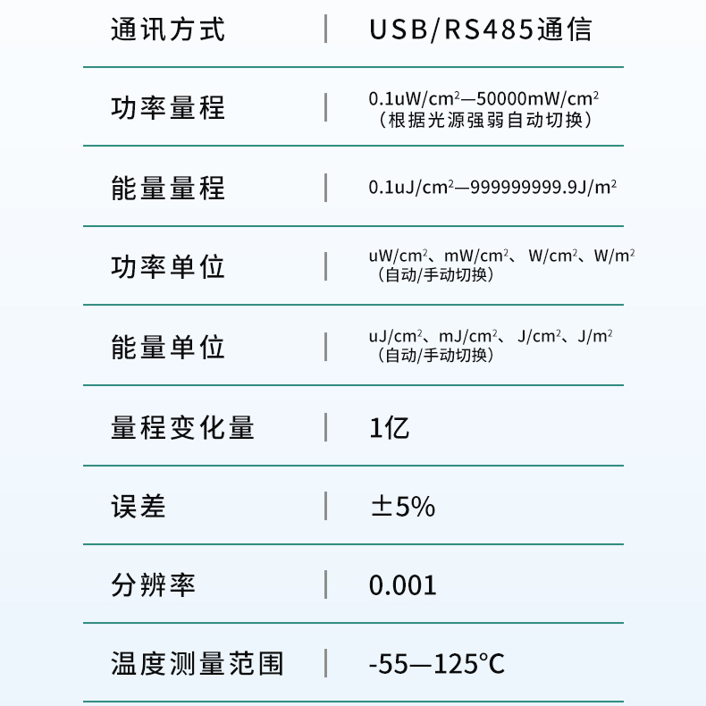 0.1uw/cm2-5萬mw/cm2(根據光源強弱自動切換單位) |