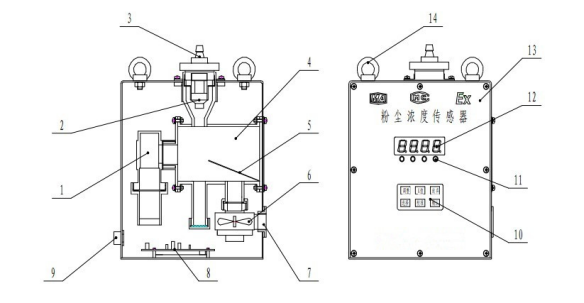 1 光電轉換器、2 激光發生器、3 進氣口、4 暗室、5 整流板、6 抽風機、7 排氣口、8 主控板、9 接口插座、10 設置鍵盤、11 狀態指示燈、12 數碼顯示屏、13 鋼制外殼、14 安裝吊環