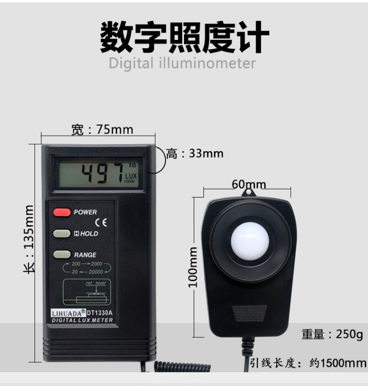 TES-1330A:測量范圍:20/200/2000/20000Lux,量程自動轉換。