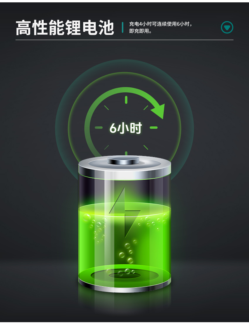 3.高性能鋰電池,充電4小時可連續使用6小時,即充即用。
