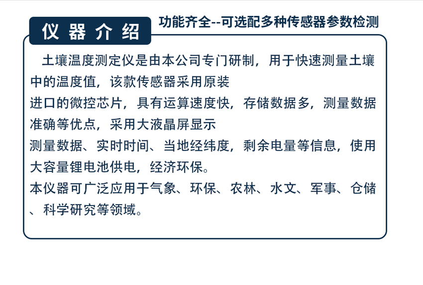 該款土壤溫度測(cè)定儀是由本公司專門研制,用于快速測(cè)量土壤中的溫度值,該款傳感器采用原裝進(jìn)口的微控芯片,具有運(yùn)算速度快,存儲(chǔ)數(shù)據(jù)多,測(cè)量數(shù)據(jù)準(zhǔn)確等優(yōu)點(diǎn),采用大液晶屏顯示測(cè)量數(shù)據(jù)、實(shí)時(shí)時(shí)間、當(dāng)?shù)亟?jīng)緯度,剩余電量等信息,使用大容量鋰電池供電,經(jīng)濟(jì)環(huán)保。