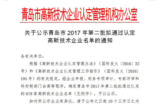 熱烈慶祝青島聚創環保集團有限公司通過高 新技術企業認證