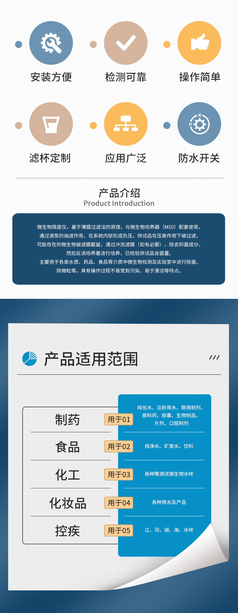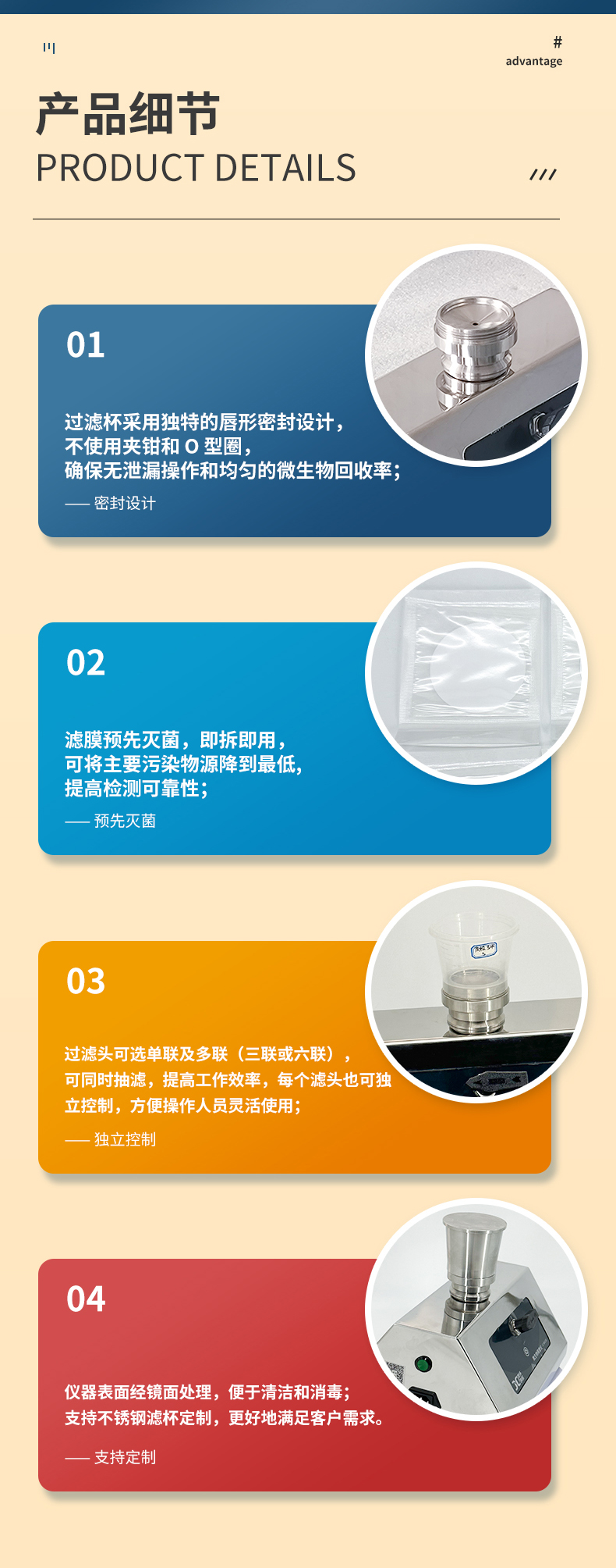 1、過濾杯采用特別的唇形密封設(shè)計(jì),不使用夾鉗和 O 型圈,確保無泄 漏操作和均勻的微生物回收率;