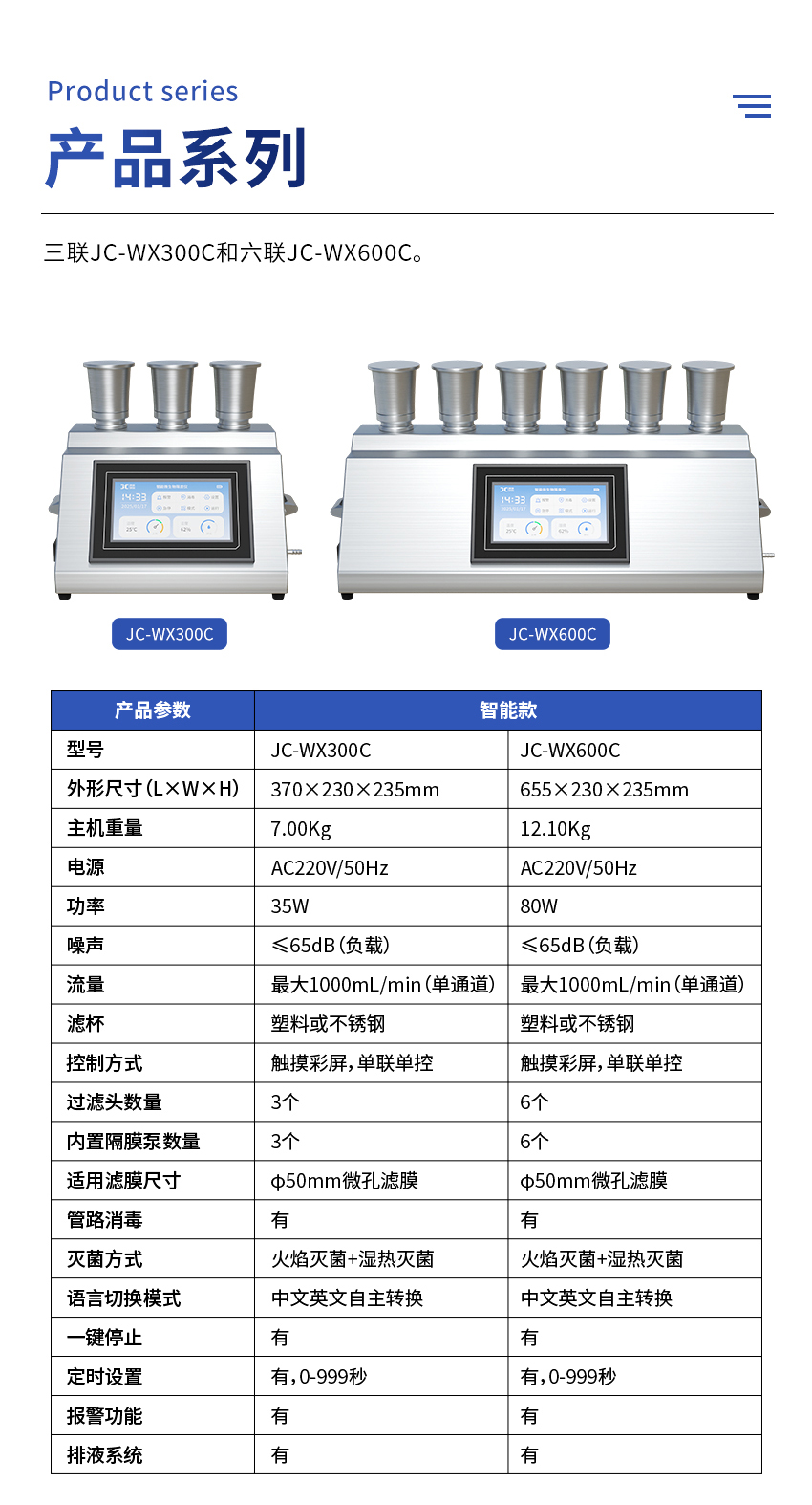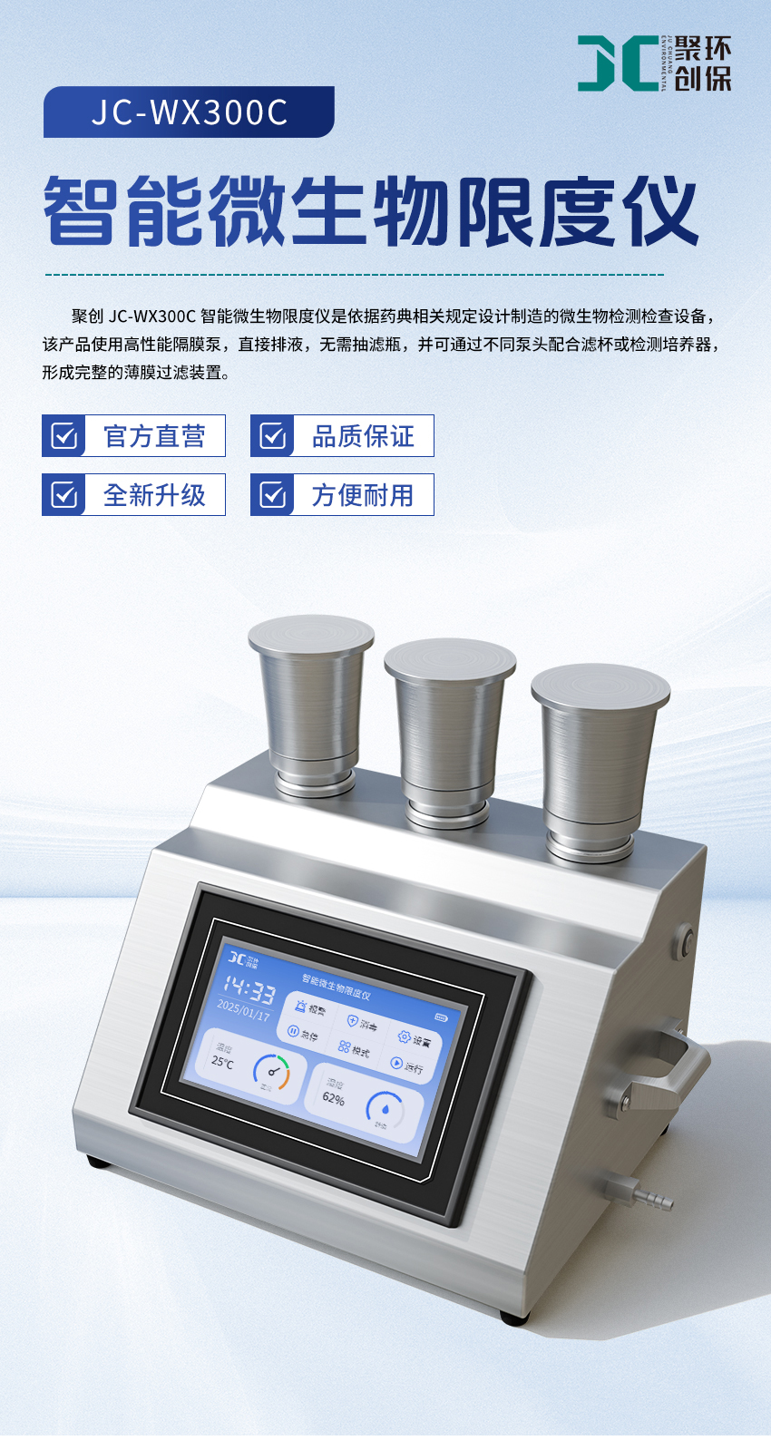 聚創智能三聯微生物限度儀JC-WX300C基于薄膜過濾法的原理,與微生物培養器(M50)配套使用,通過液泵的抽濾作用,在系統內部形成負壓,供試品在壓差作用下被過濾,可能存在的微生物被濾膜截留,通過沖洗濾膜(如有必要),除去抑菌成分,然后反澆培養基進行培養,已檢驗供試品含菌量。主要用于各類水質、藥品、食品等介質中微生物檢測及實驗室中進行除菌、除微粒等。具有操作過程不易受到污染、易于清潔等特點。