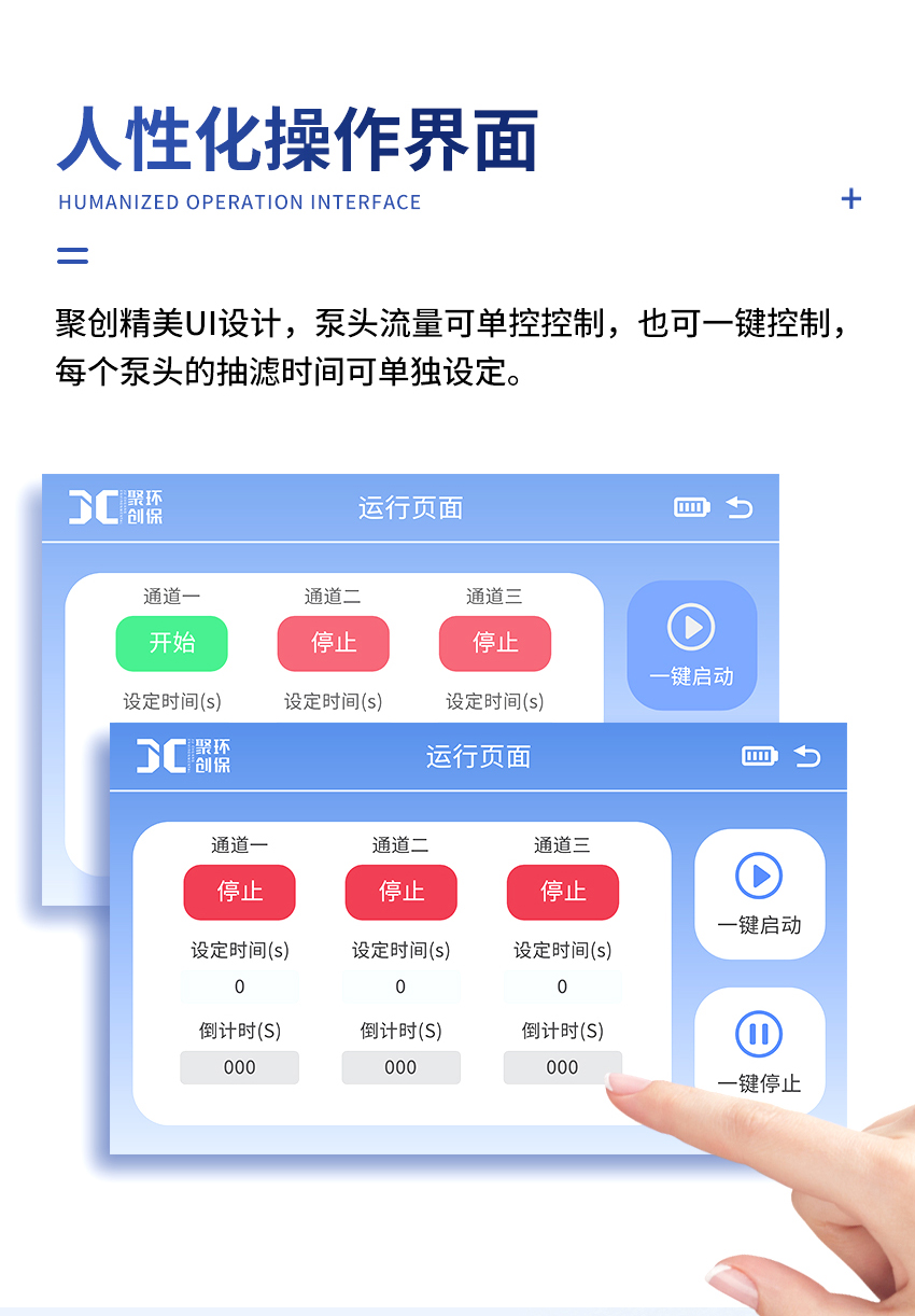 4.人性化操作界面:7寸全彩觸摸屏搭配聚創精美UI設計,可控制單個泵頭流量,也可一鍵控制所有泵頭流量,每個泵頭的抽濾時間可單獨設定。