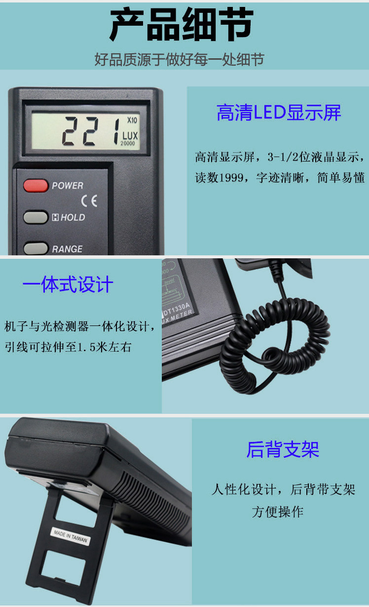 TES-1339:測量范圍0.01Lux至999900 Lux,具有均值測量 / 照度積分測量、發強度測量、扣除雜散光之光源照度測量、間設定自動鎖定測量等功能。
