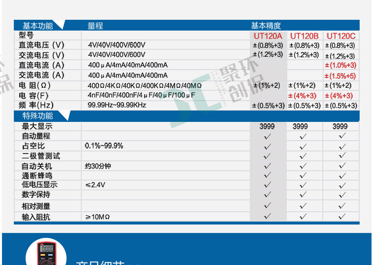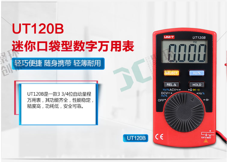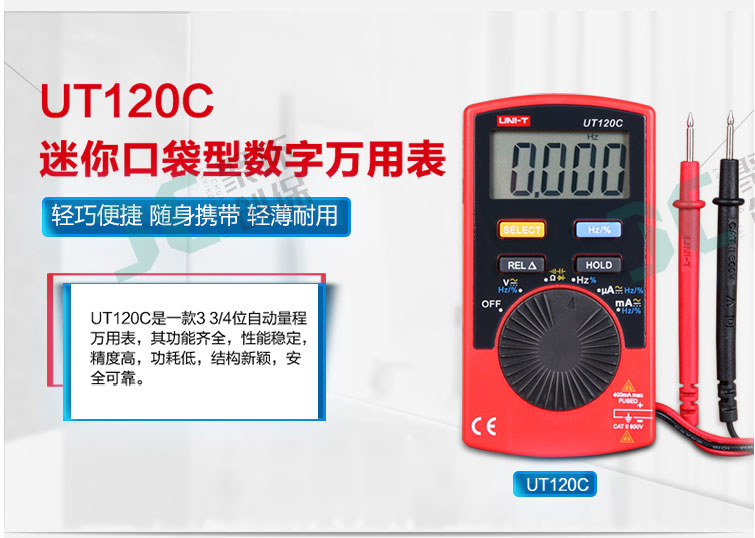UT120系列是一款可隨身攜帶、小巧、輕便的3 3/4位自動量程口袋型數字萬用表,其功能齊全,性能穩定,精度高,功耗低,結構新穎,安全可靠,操作簡單,好用、耐磨、耐用,是廣大用戶的理想測量儀表。可用于家庭、學校、冶煉、通訊、制造、石油、電力、化工等領域,是電路/電力設備維護和維修的理想工具。