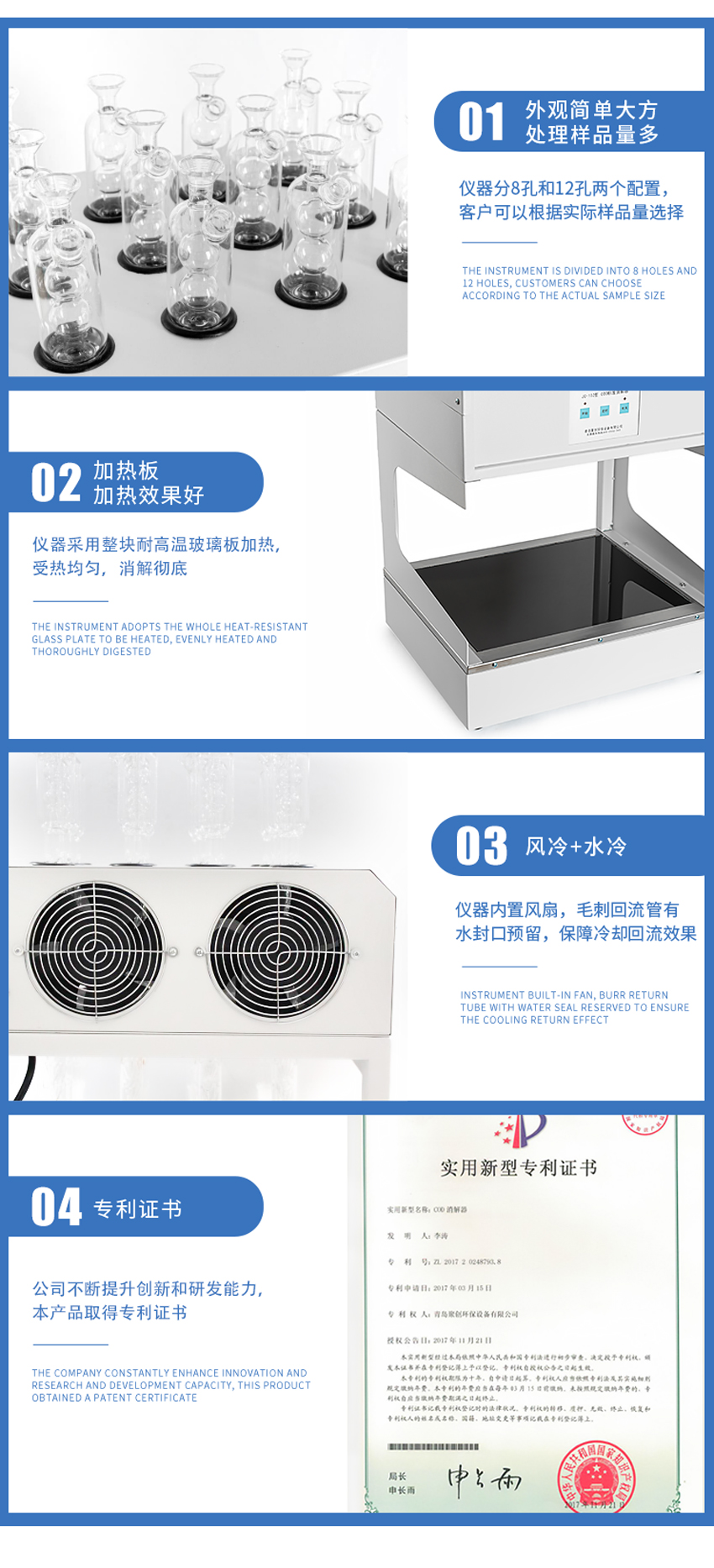 JC-102型標準COD消解器采用微機技術進行定時控制加熱電爐,可對8個250ml錐形消解回流裝置同時進行加熱。達到節能、減低電力負荷、節水、提高 效率的目的。