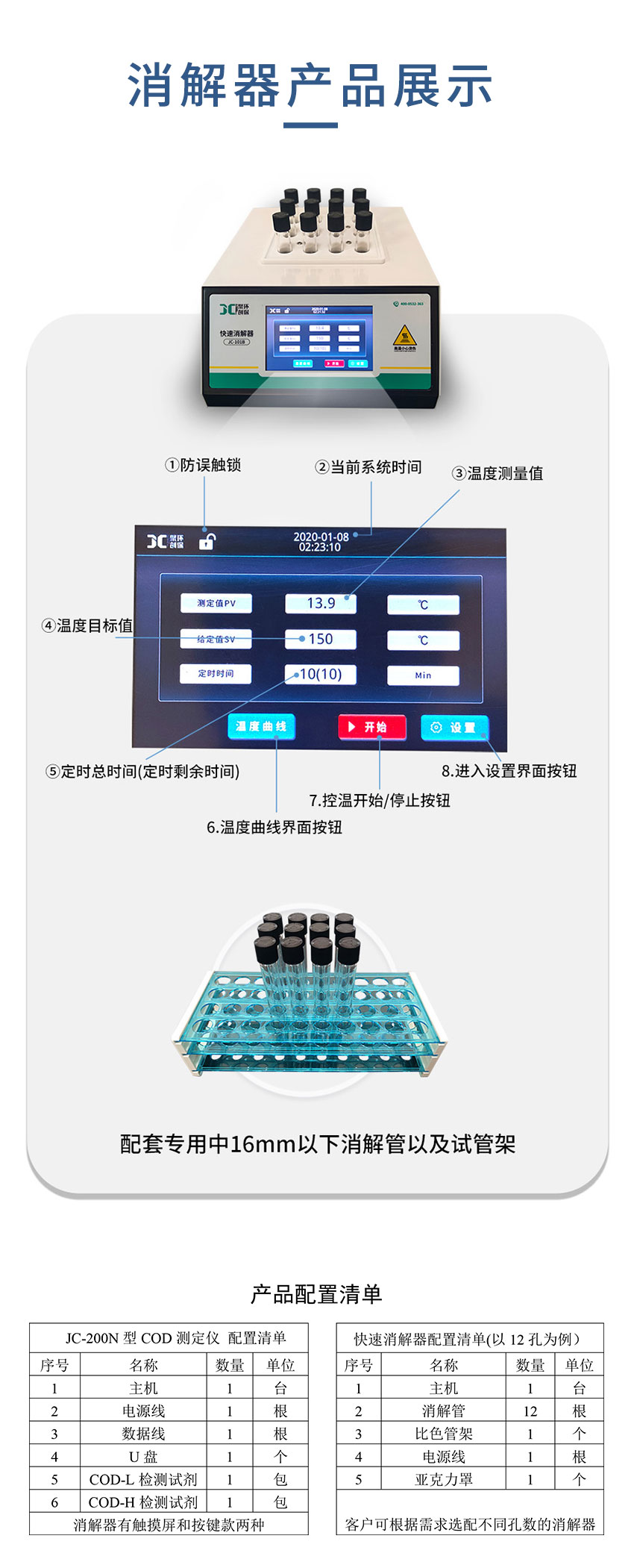 聚創JC-200N型COD快速測定儀依據《HJ/T 399 水質 化學需氧量的測定 快速消解分光光度法》設計并開發,能準確快速測定水樣的COD指標,適用于檢測地表水、地下水等一般環境水樣和中輕度污染廢水水樣。可廣泛應用于環保監測站、污水處理廠、大專院校、科研院所、石化、造紙、印染、電子、電力、鋼鐵、農業、市政工程等行業。
