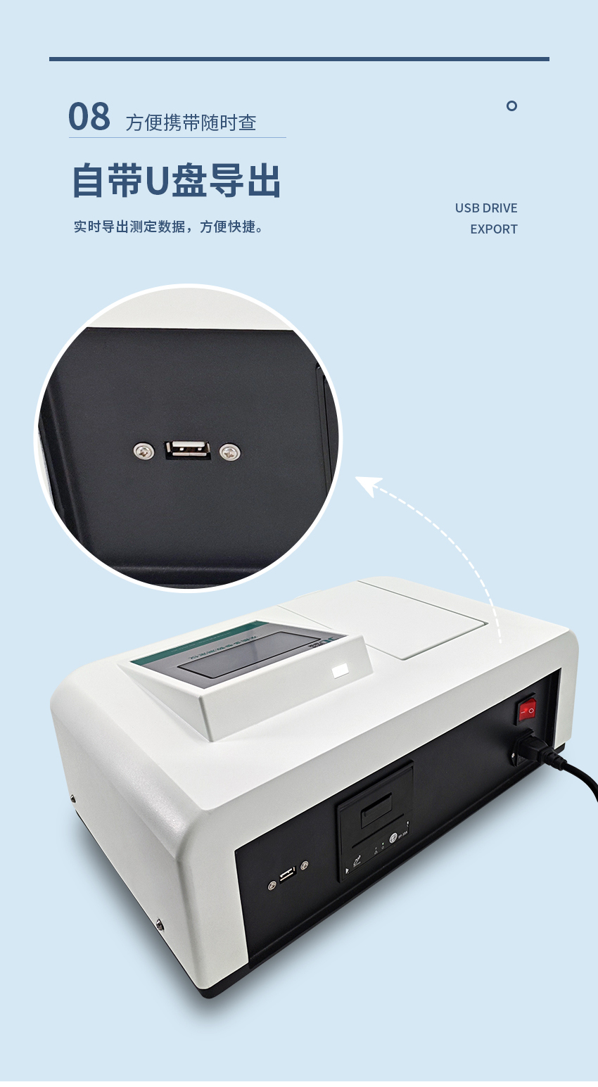10. 多樣數據輸出方式:標配微型打印機,可即時打印當前數據,也可隨時查詢打印已保存數據。同時配備USB數據傳輸接口,能夠快速將數據保存至U盤,滿足用戶不同的數據存儲和分享需求。