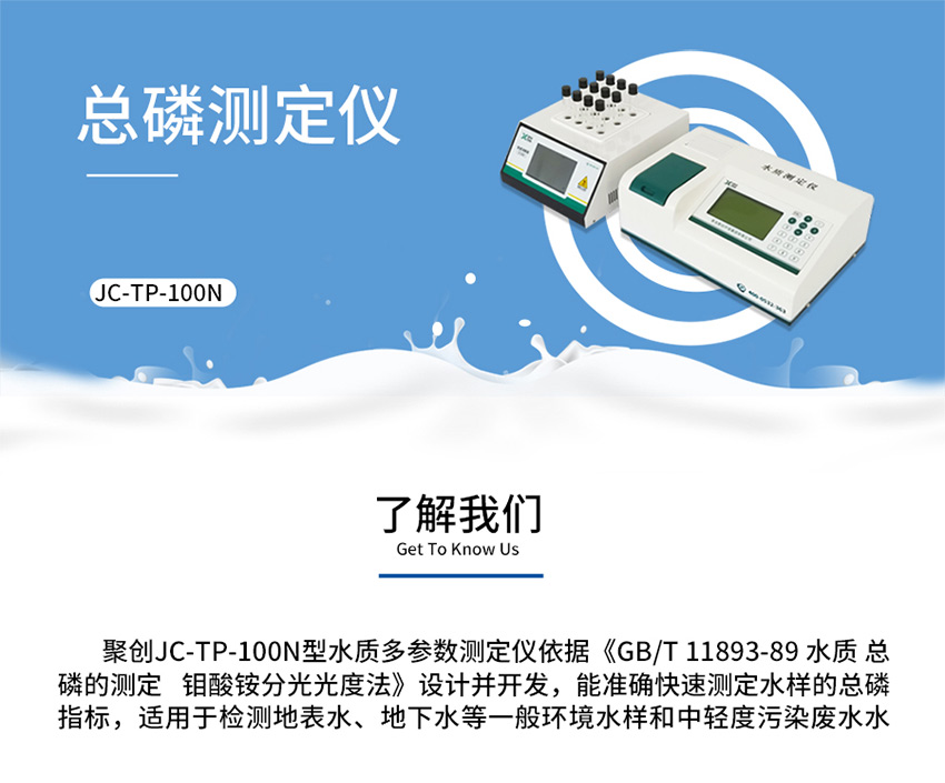 聚創JC-TP-100N型水質多參數測定儀依據《GB/T 11893-89 水質 總磷的測定 鉬酸銨分光光度法》設計并開發,能準確快速測定水樣的總磷指標,適用于檢測地表水、地下水等一般環境水樣和中輕度污染廢水水樣。可廣泛應用于環保監測站、污水處理廠、大專院校、科研院所、石化、造紙、印染、電子、電力、鋼鐵、農業、市政工程等行業。