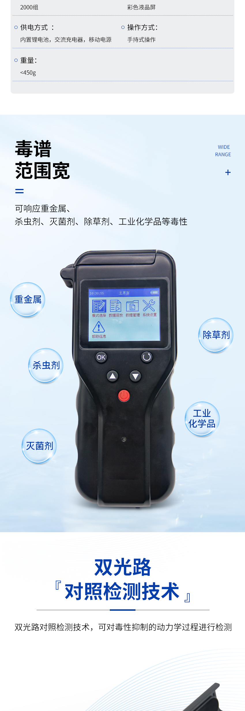 檢測(cè)范圍寬,可檢測(cè)重金屬離子、有機(jī)農(nóng)藥、有機(jī)和無(wú)機(jī)有毒物質(zhì)等