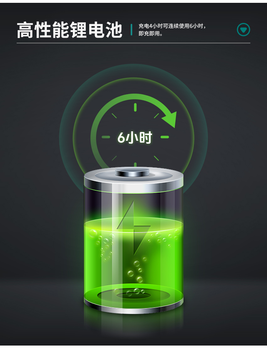 1.高性能鋰電池,充電4小時可連續使用6小時,即充即用。