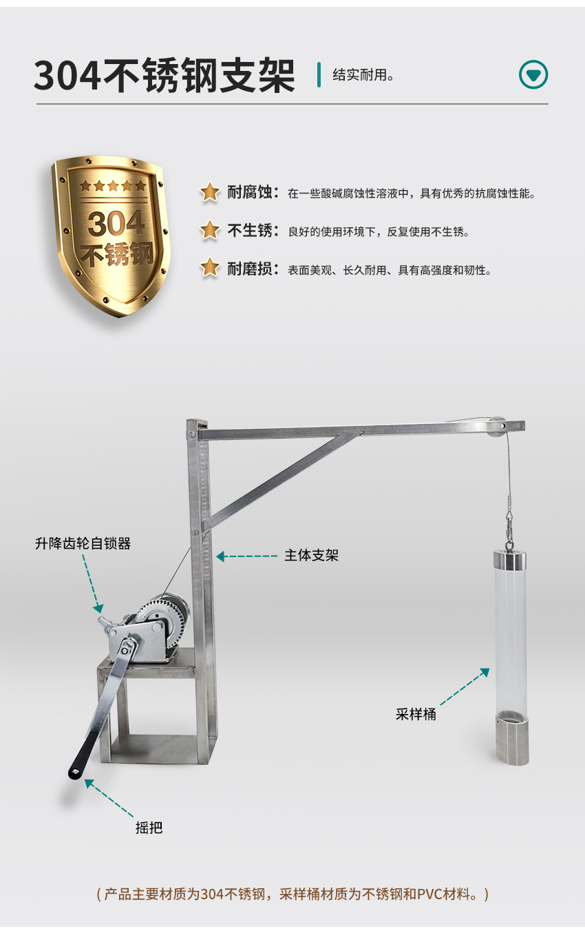 1.產品主要材質為304不銹鋼,采樣桶材質為不銹鋼和PVC材料。