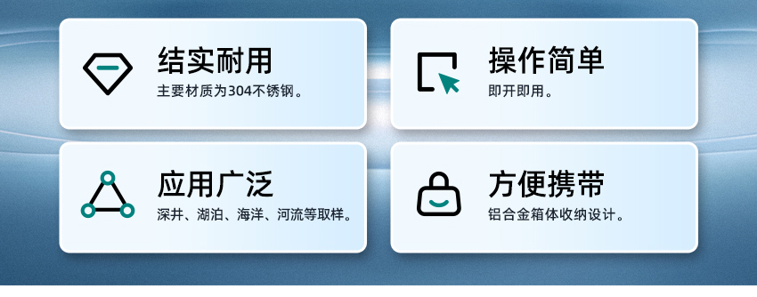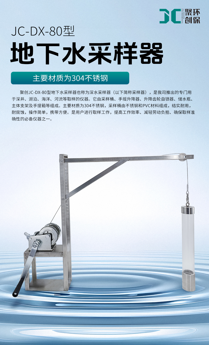 地下水采樣器,也稱為深水采樣器(以下簡稱采樣器),是本公司推出的專門用于深井、湖泊、海洋、河流等取樣的儀器。它由采樣桶、手搖升降器、升降齒輪自鎖器、儲水瓶、主體支架及手提箱等組成。主要材質為304不銹鋼,采樣桶由不銹鋼和PVC材料構成,結實耐腐蝕,具有操作簡單、攜帶方便的特點。該采樣器是用戶進行取樣工作,提高工作效率、減輕勞動負擔、確保取樣準確性的必備儀器之一。