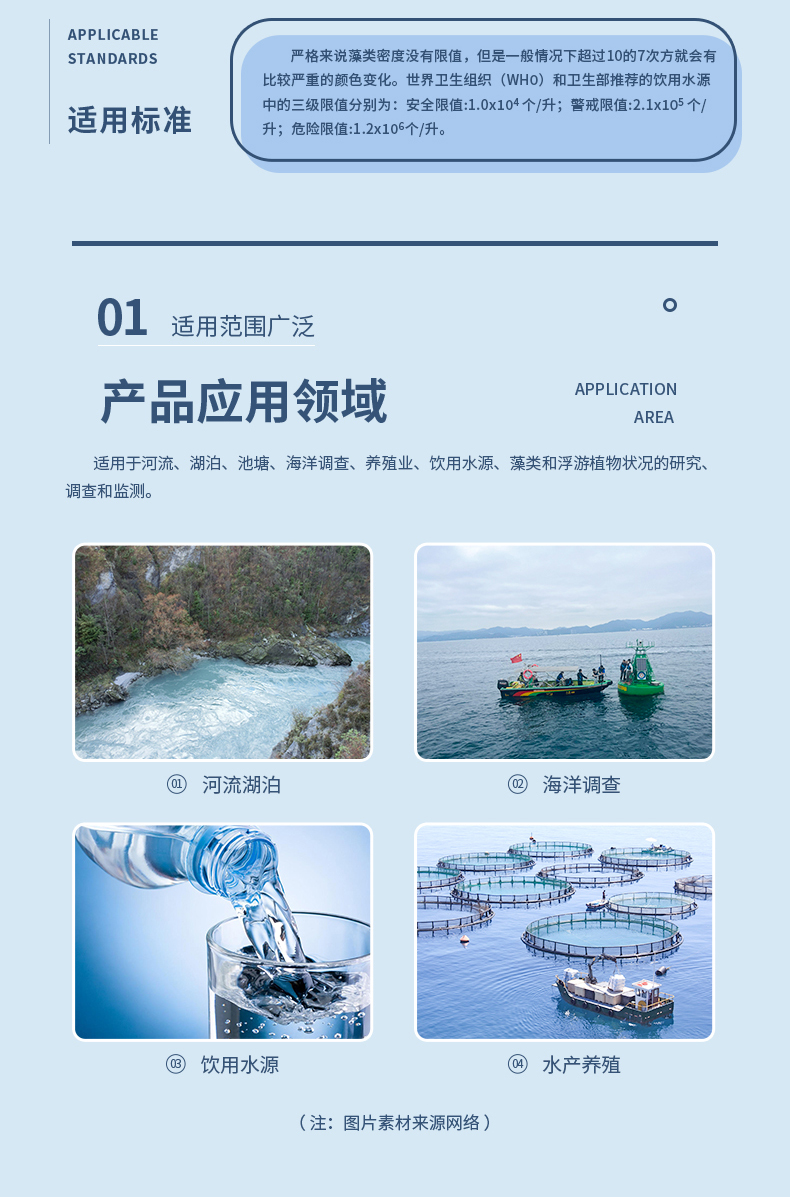 適用于河流、湖泊、池塘、海洋調查、養殖業、飲用水源、藻類和浮游植物狀況的研究、調查和監測。