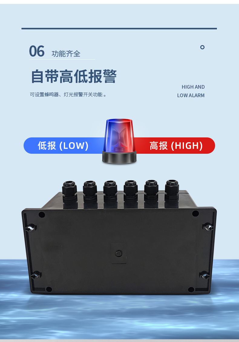 分為高點、低點報警輸出,繼電器滯后量任意設定,繼電器最大負載30VDC/5A