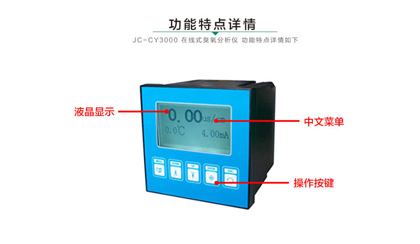 JC-CY3000型在線式臭氧檢測儀是一款微機型的水中臭氧在線測控儀,采用先進的非膜式恒電壓傳感器,無須更換膜片與試劑,靈敏度高,信號響應迅速,測量準確、性能穩定、維護簡單。該水中臭氧測控系統具有使用方便、準確度高、經濟的特點。運用這一系列先進的分析技術,確保儀器長期工作的穩定可靠性和準確性。具有中文菜單式操作、485通訊等功能。
