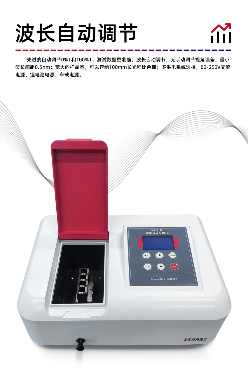 創(chuàng)新:先進的自動調(diào)節(jié)0%T和100%T,測試數(shù)據(jù)更準確;波長自動調(diào)節(jié),無手動調(diào)節(jié)視角誤差,最小波長間距0.5nm;寬大的樣品室,可以容納100mm長光程比色皿;多供電系統(tǒng)選擇,80-250V交流電源、鋰電池電源、車載電源。