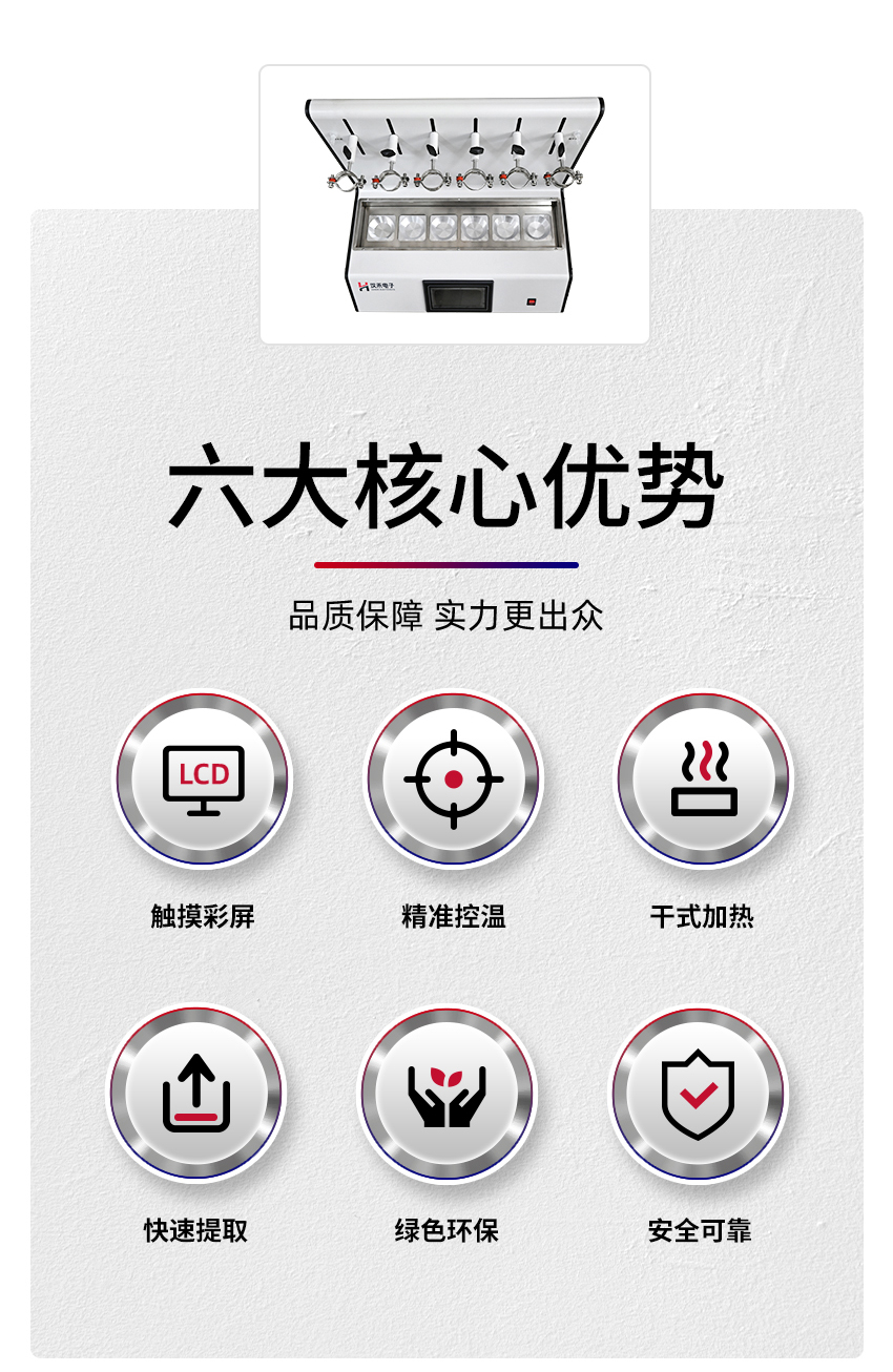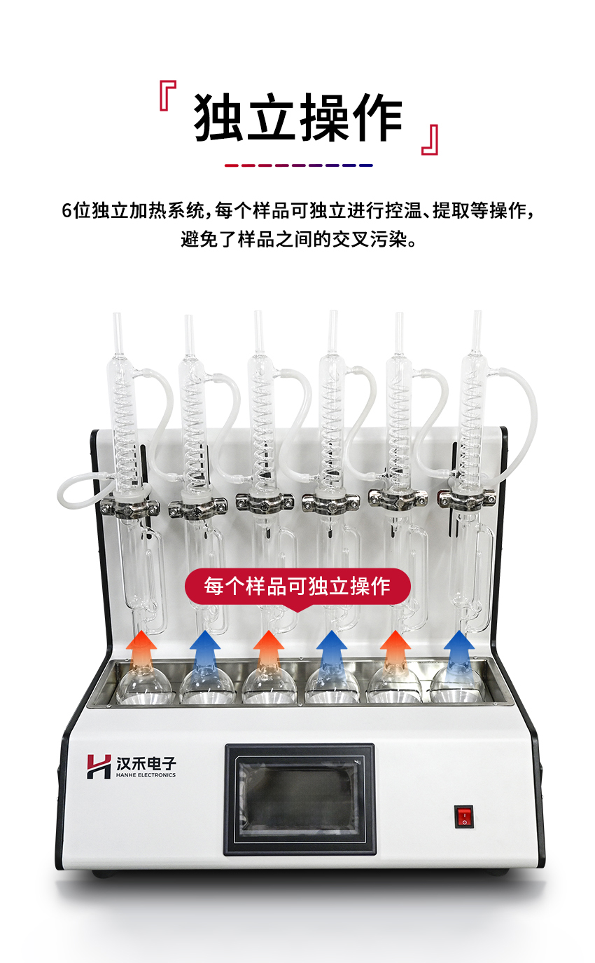 2. 獨立操作:具備6位獨立加熱系統,每個樣品均可獨立進行控溫、提取等操作。這不僅避免了樣品之間的交叉污染,還方便同時處理不同類型或不同條件要求的樣品,有效提高了實驗的靈活性和效率。