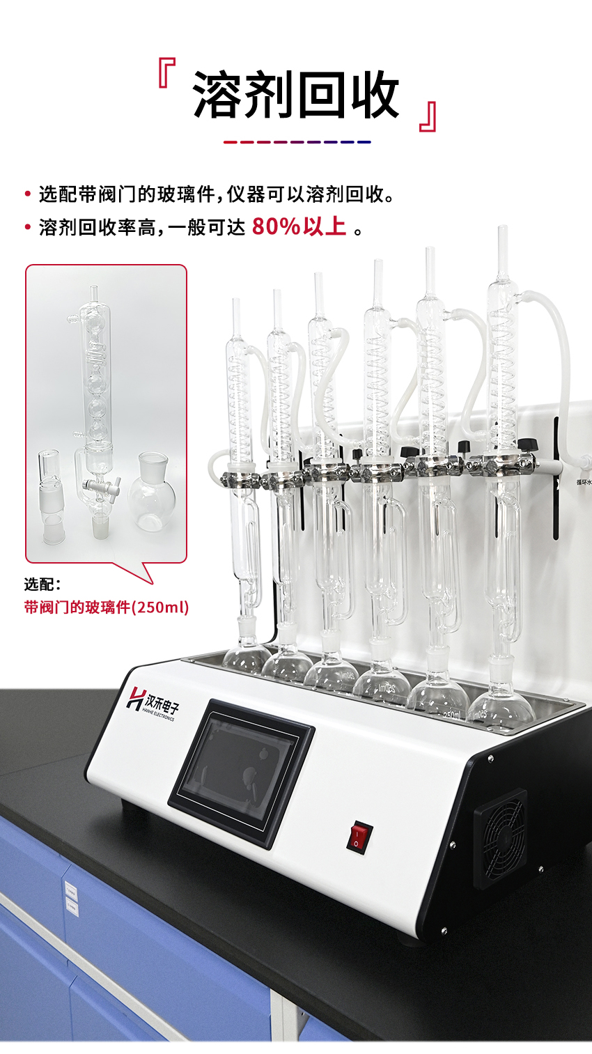 5. 溶劑回收:選用帶閥門玻璃件,儀器具備溶劑回收功能,且溶劑回收率高,一般可達80%以上。這既能有效節約實驗耗材,降低實驗成本,又能減少溶劑排放對環境的污染。