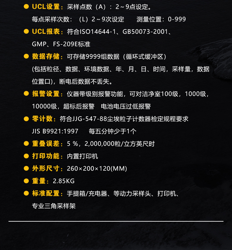 該儀器是公司新研制成功的采用全半體激光傳感器的激光塵埃粒子計數器,技術指標均滿足國家計量總局頒布的JJF1190-2008檢定規程的要求,整機功能采用美國微電腦控制處理技術及半導體激光傳感器技術及進口氣泵,具有功能多、測量精度高、速度快、便于攜帶和操作簡單等特點。儀器一次采樣可同時測得多種粒徑的塵埃粒子數,該產品已被廣泛應用于電子生產企業潔凈室檢測;過濾器現場檢測、撿漏;可監測生物安全,HVAC系統,計算機室,飲料包裝環境,汽車噴涂環境,微電子、生化制品、食品衛生、精細化工、精密機械和航空航天等生產和科研部門,是暖通空調企業及其監督管理部門貫徹GMP規范和電子生產企業儀器。